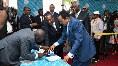 Le Président-Candidat, et Madame Chantal BIYA, ont, pourrait-on ajouter, comme de tradition, voté au quartier Bastos à Yaoundé, dans ce Bureau de Vote de réputation historique, dans lequel le Couple Présidentiel y est inscrit, depuis plusieurs échéances électorales.