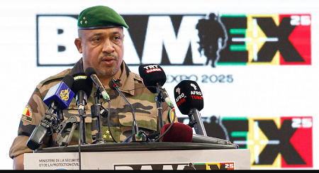 Le ministre malien de la sécurité et de la protection civile, Daoud Aly Mohammedine, s’exprime lors de la journée d’ouverture du Salon de la défense Bamex 25 à Bamako, le 11 novembre 2025. Les autorités de la transition, en place depuis 2021, veulent donner l’apparence d’une vie normale dans la capitale et dans le pays, malgré le blocus sur le carburant imposé par les djihadistes du JNIM. AFP