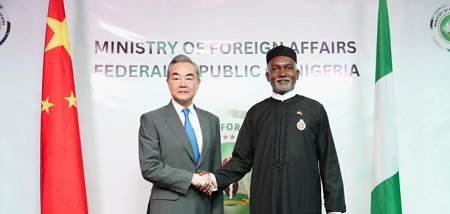 Le ministre chinois des Affaires étrangères, Wang Yi (à gauche), serre la main de son homologue nigérian, Yusuf Tuggar, lors de leur rencontre à Abuja, au Nigéria, le 9 janvier 2025. (Photo/Xinhua)